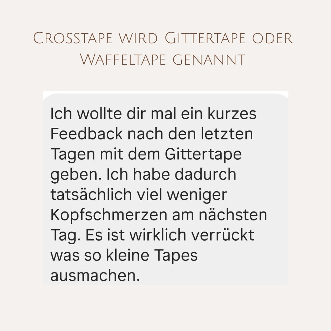 Die aus Asien stammenden Gitterpflaster (Crosstape oder Waffeltape genannt) sind eine hautfreundliche, schonende Methode, um dein Wohlbefinden zu steigern. Sie wirken gezielt auf Triggerpunkte, Schmerzpunkte, Akupunkturpunkte und Meridiane – ähnlich wie bei Akupressur oder Akupunktur. Das Ziel: Blockaden lösen, Energiefluss harmonisieren und die Selbstheilung deines Körpers aktivieren.